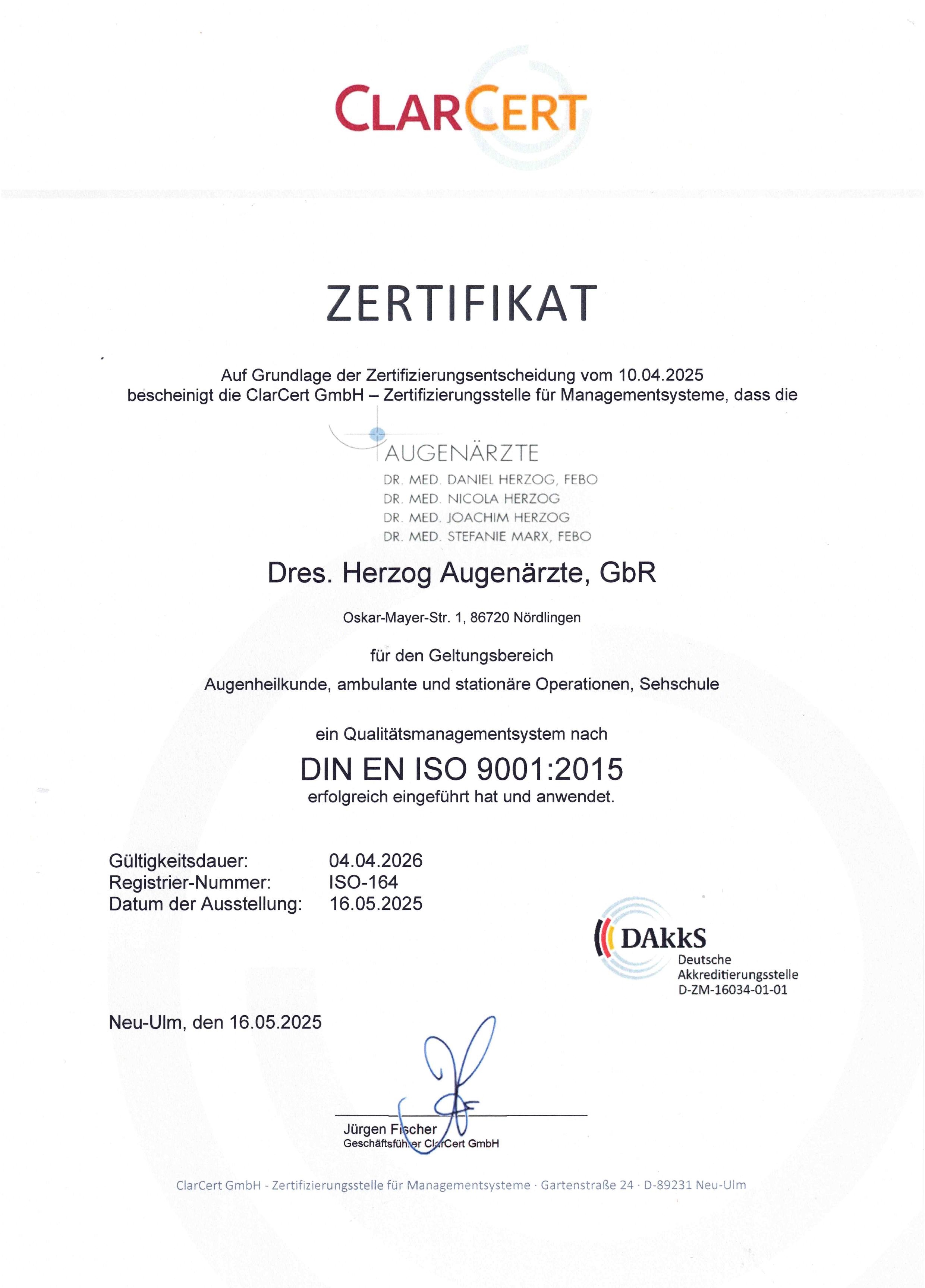 Wir haben in unserer Augenärztepraxis und bei den belegärztlichen Operationen im Stiftungskrankenhaus im Juni 2007 ein Qualitätsmanagementsystem (QM) eingeführt und dieses zuletzt 2023 nach der international anerkannten und angewendeten Norm ISO 9001:2015 von der Zertifizierungsstelle ClarCert GmbH zertifizieren lassen.
